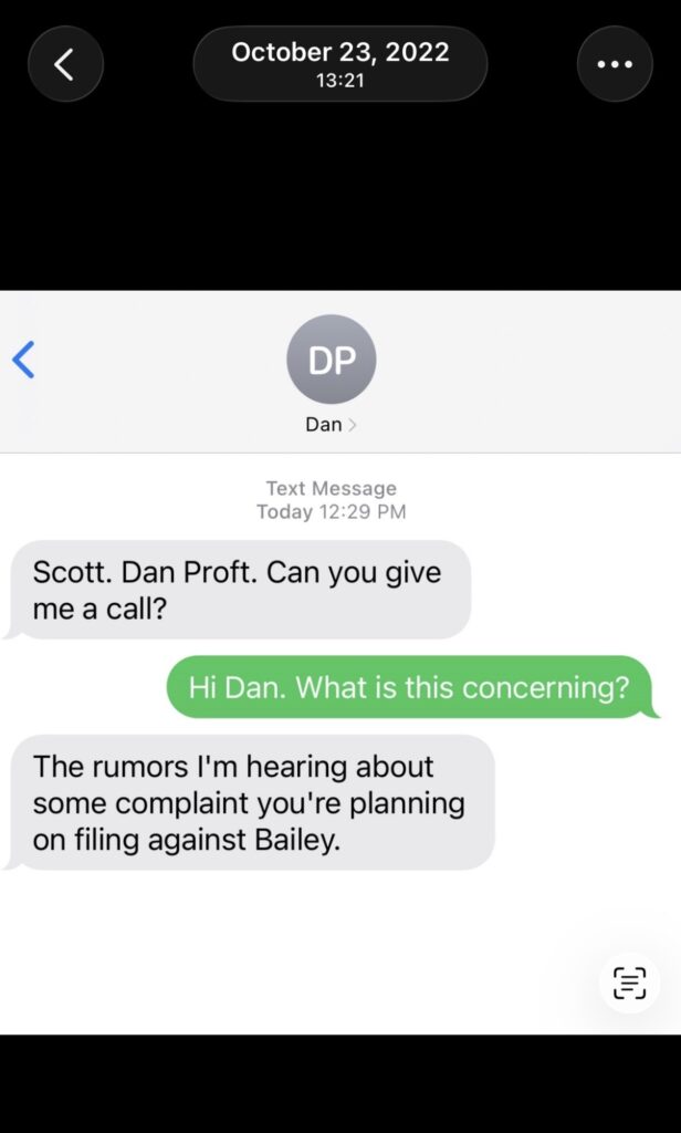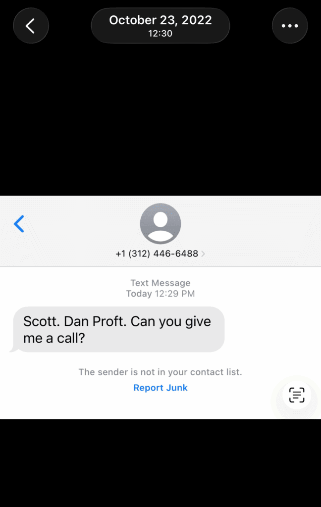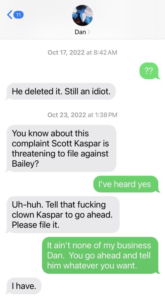 Two days later, on October 23, 2022, Proft reached out to Kaspar by text for the first time. “Scott. Dan Proft. Can you give me a call?” he wrote. Kaspar’s phone didn’t recognize the number – confirming that Proft wasn’t previously in his contacts.