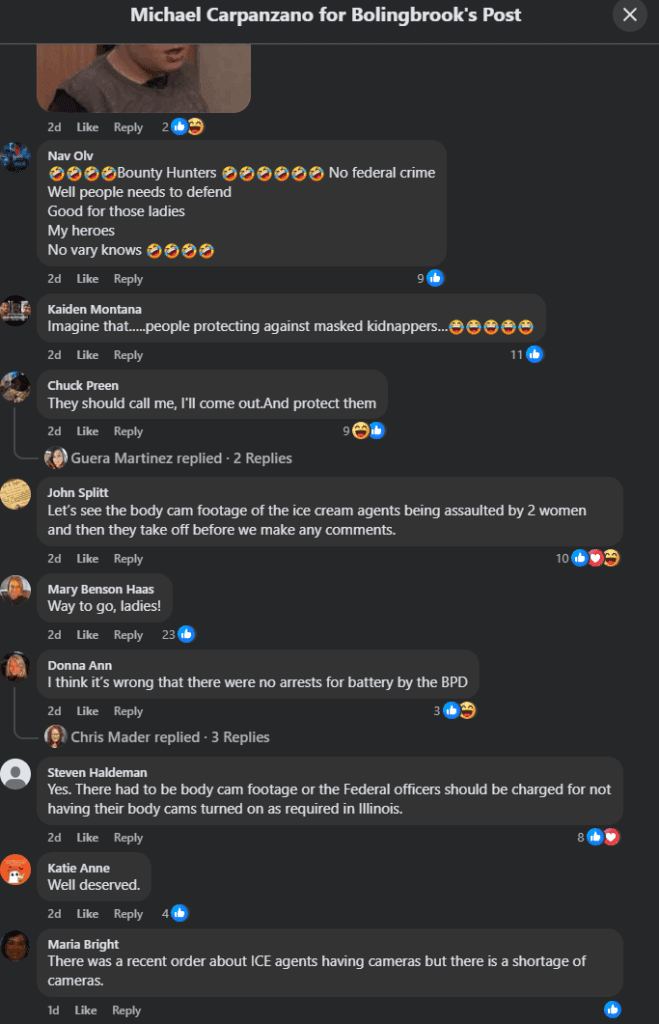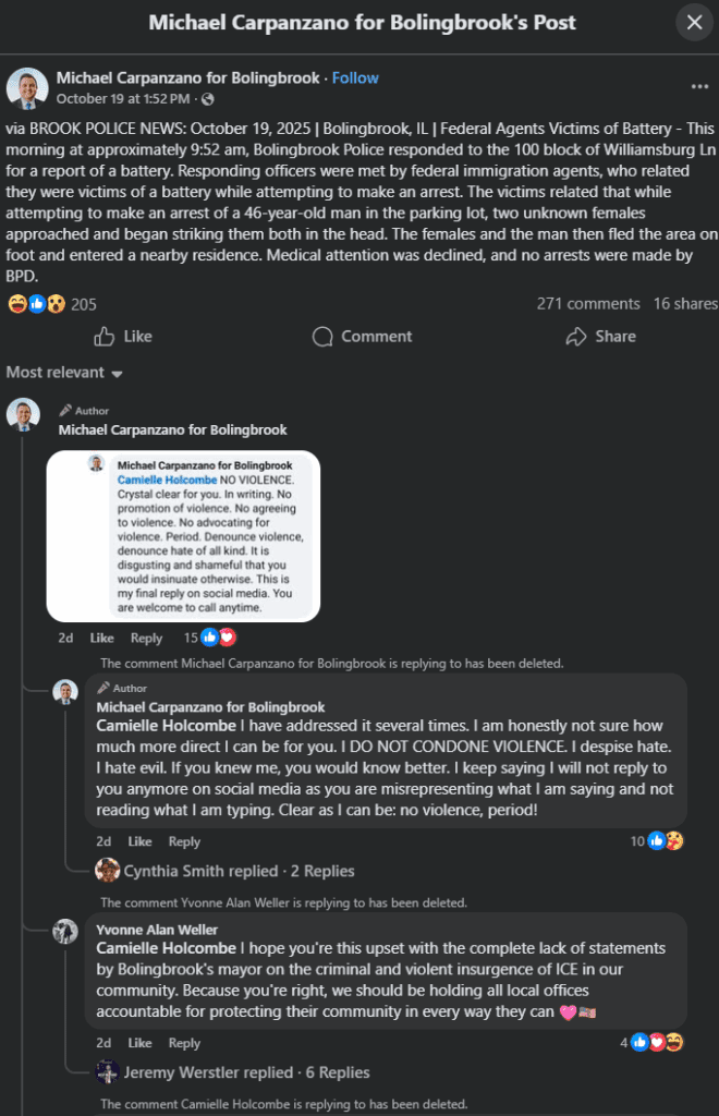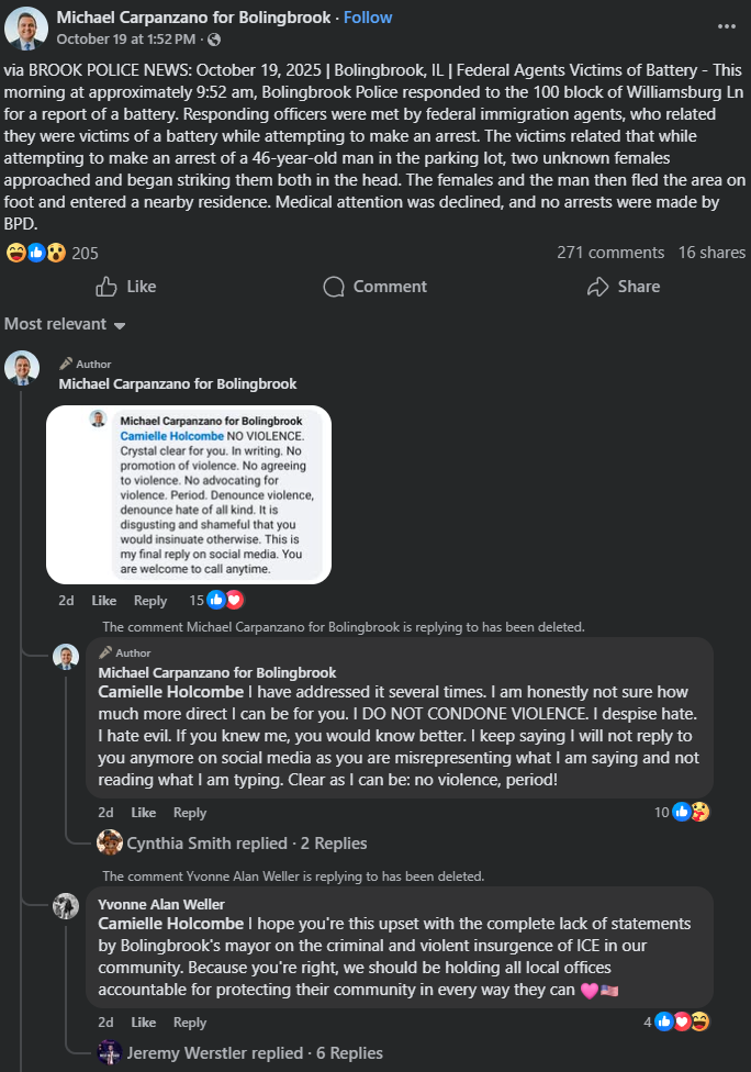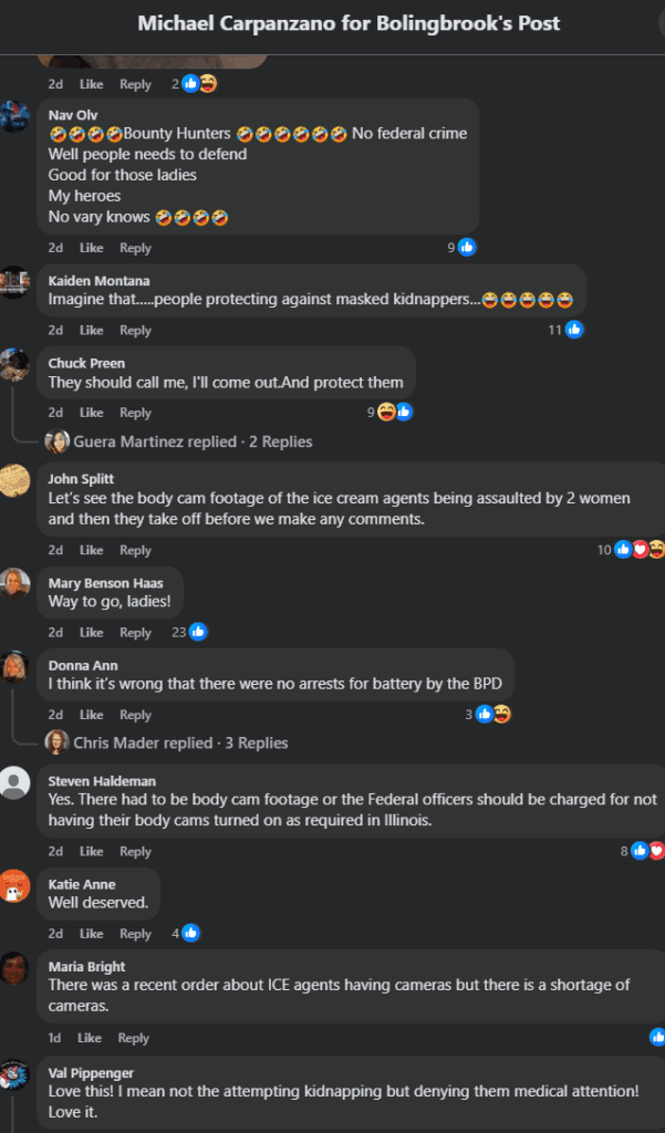Village Trustee Michael Carpanzano, who oversees and helps manage multiple Bolingbrook-affiliated Facebook pages, was confronted by residents demanding accountability. According to screenshots and eyewitness accounts, Carpanzano eventually replied to one commenter but ignored dozens of others who celebrated or endorsed violence.
