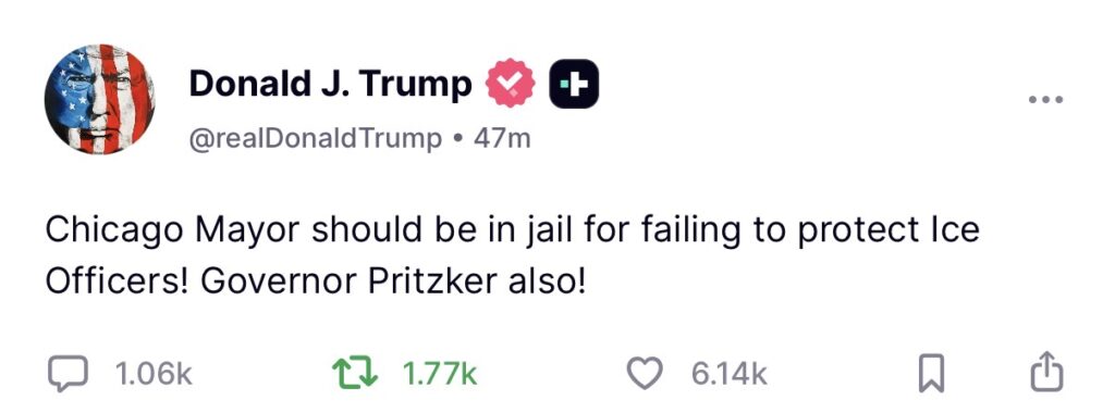 “Chicago Mayor should be in jail for failing to protect Ice Officers!,” President Trump wrote on Truth Social. “Governor Pritzker also!”