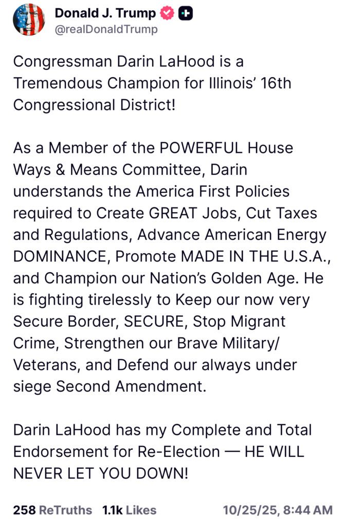Trump closed his post with his trademark declaration: “Darin LaHood has my Complete and Total Endorsement for Re-Election – HE WILL NEVER LET YOU DOWN!”