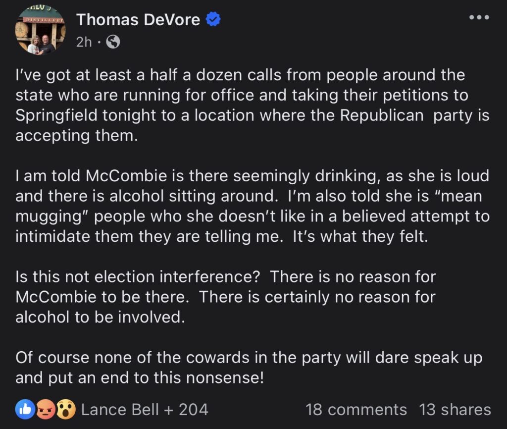 “I’ve got at least a half dozen calls from people around the state… I am told McCombie is there seemingly drinking, as she is loud and there is alcohol sitting around,” DeVore wrote. “She is ‘mean-mugging’ people she doesn’t like in a believed attempt to intimidate them. It’s what they felt.”