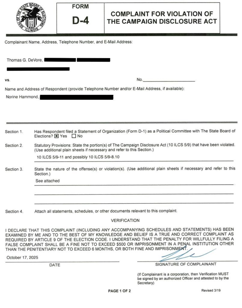 The complaint, filed pursuant to 10 ILCS 5/9-20 of the Illinois Election Code, alleges that Hammond’s campaign committee – Citizens for Hammond – has engaged in a pattern of questionable reimbursements that may violate Article IX of state campaign finance law.