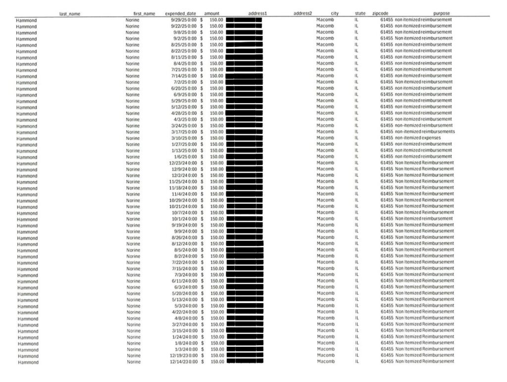 The documents submitted to the Illinois State Board of Elections detail a series of payments made directly to Hammond from her campaign fund, often in amounts just below the threshold that would require full disclosure if the payments would have been labelled non-itemized expenditures.