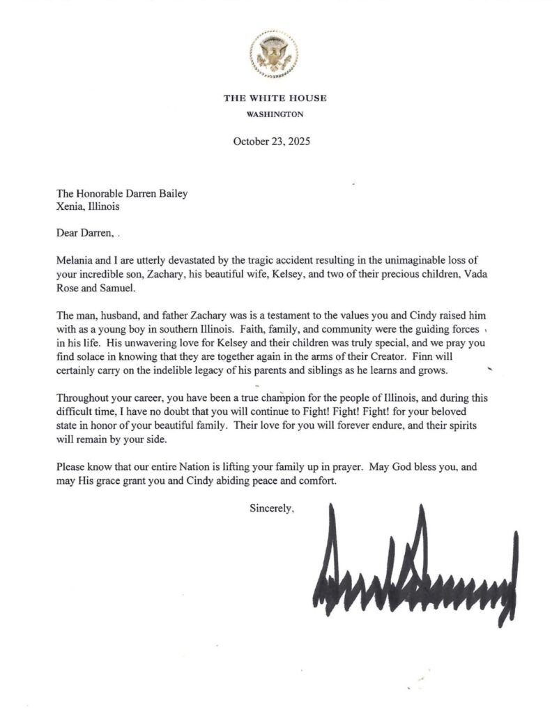 In a deeply personal gesture, President Donald J. Trump has sent a powerful condolence letter on official presidential letterhead to former State Senator Darren Bailey and his family, offering prayers and comfort after the tragic helicopter crash that claimed the lives of the Baileys’ son Zachary, his wife Kelsey, and two of their young children, Vada Rose and Samuel.