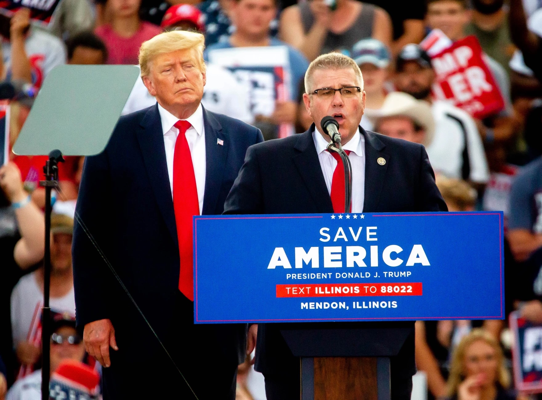 Then-Illinois State Sen. Darren Bailey, R-Xenia, speaks next to former President Donald Trump, who endorsed Bailey for Illinois’ gubernatorial race in June 2022. (Brian Munoz/St. Louis Public Radio)