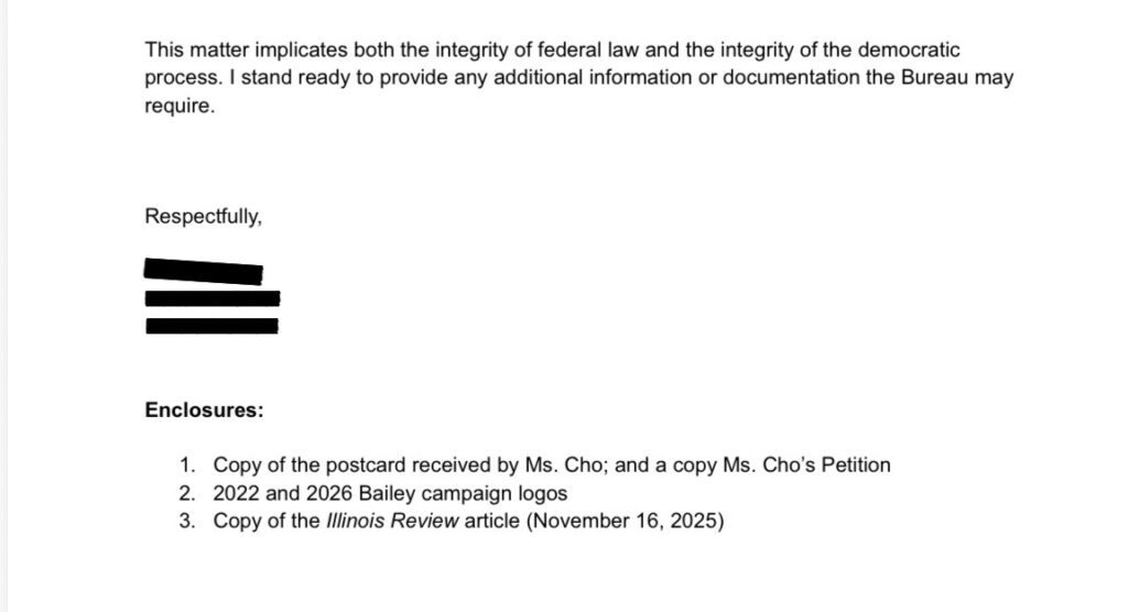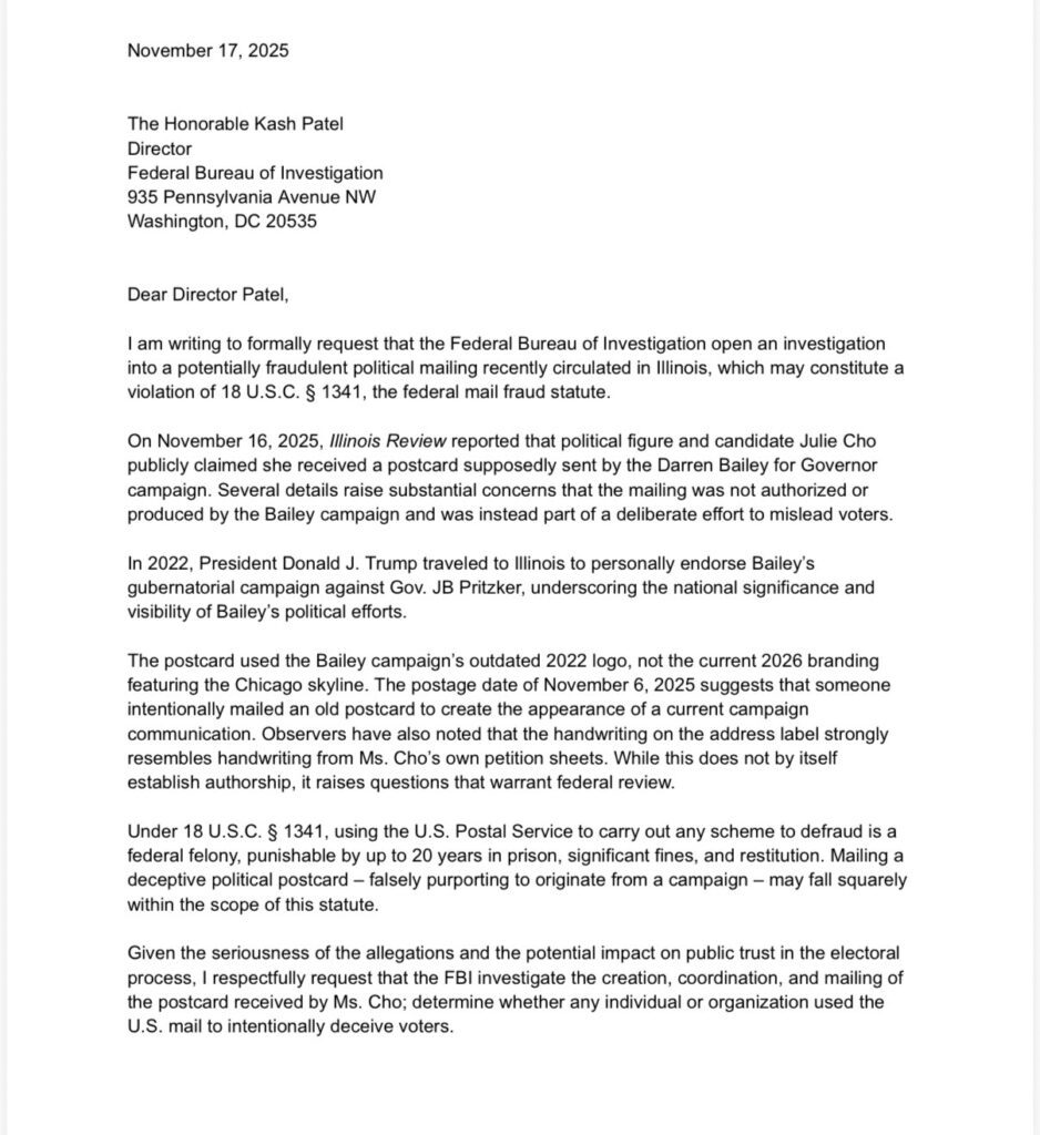 The controversy erupted on November 16, when political figure and candidate Julie Cho claimed she received a postcard “from” the Darren Bailey for Governor campaign. But within minutes of the postcard appearing online, major inconsistencies raised serious concerns – concerns that now point directly to 18 U.S.C. § 1341, the federal mail fraud statute.