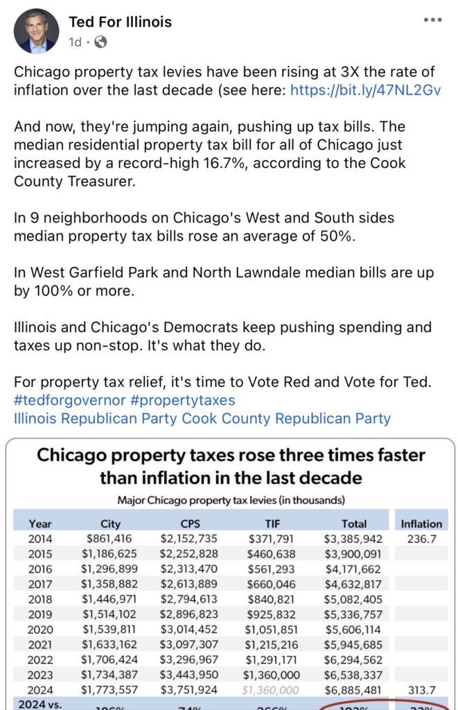 The quiet extends into the GOP gubernatorial field. Republican candidate Ted Dabrowski spent the day posting property tax graphs and levy explanations on his campaign page. His strategist Jeanne Ives hosted a Facebook Live focused exclusively on property taxes. Neither acknowledged the Pritzker-Epstein scandal dominating national news.