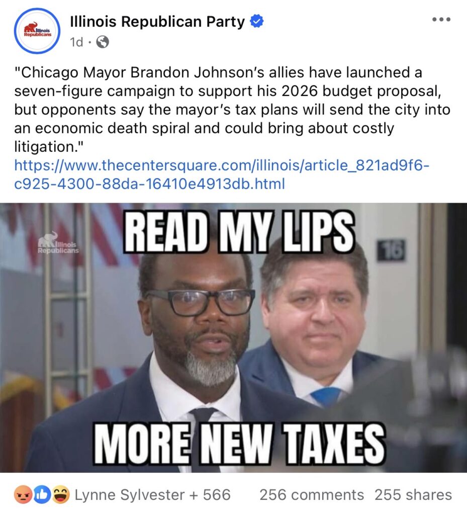 The Illinois GOP posted messages about high taxes and budget concerns, but nothing about the governor’s political operation or his cousin’s close ties to a convicted sexual predator.
