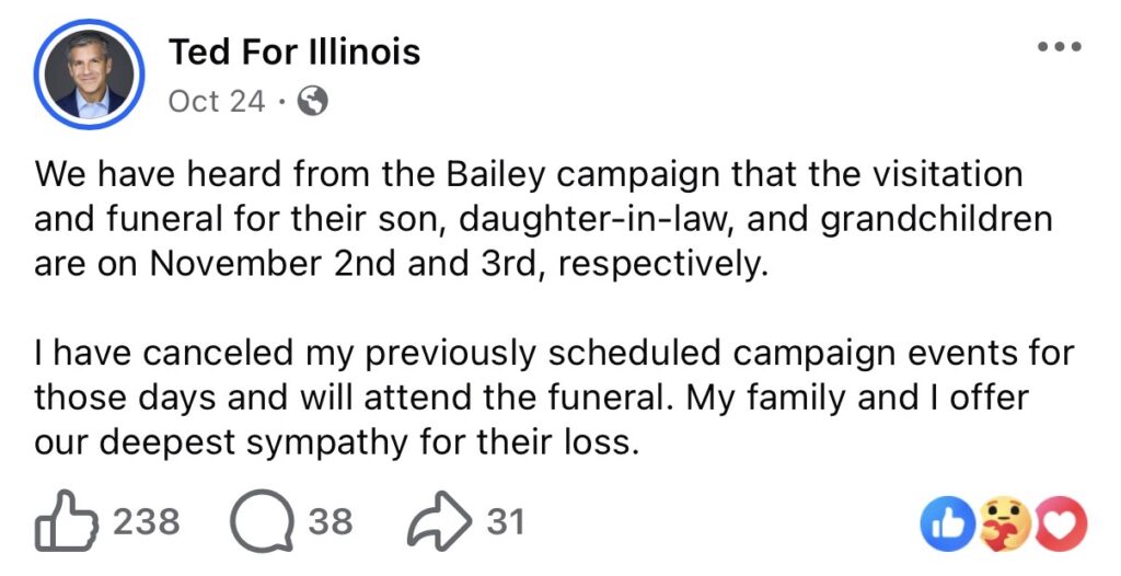 The timing couldn’t have been worse. Only days earlier, Dabrowski had publicly announced – after mounting criticism and reporting by Illinois Review – that he was canceling campaign events in southern Illinois on November 2 and 3, the dates of the visitation and funeral services for the Bailey family. At the time, Dabrowski posted on social media that he made the decision “out of respect” and said he planned to attend the funeral.