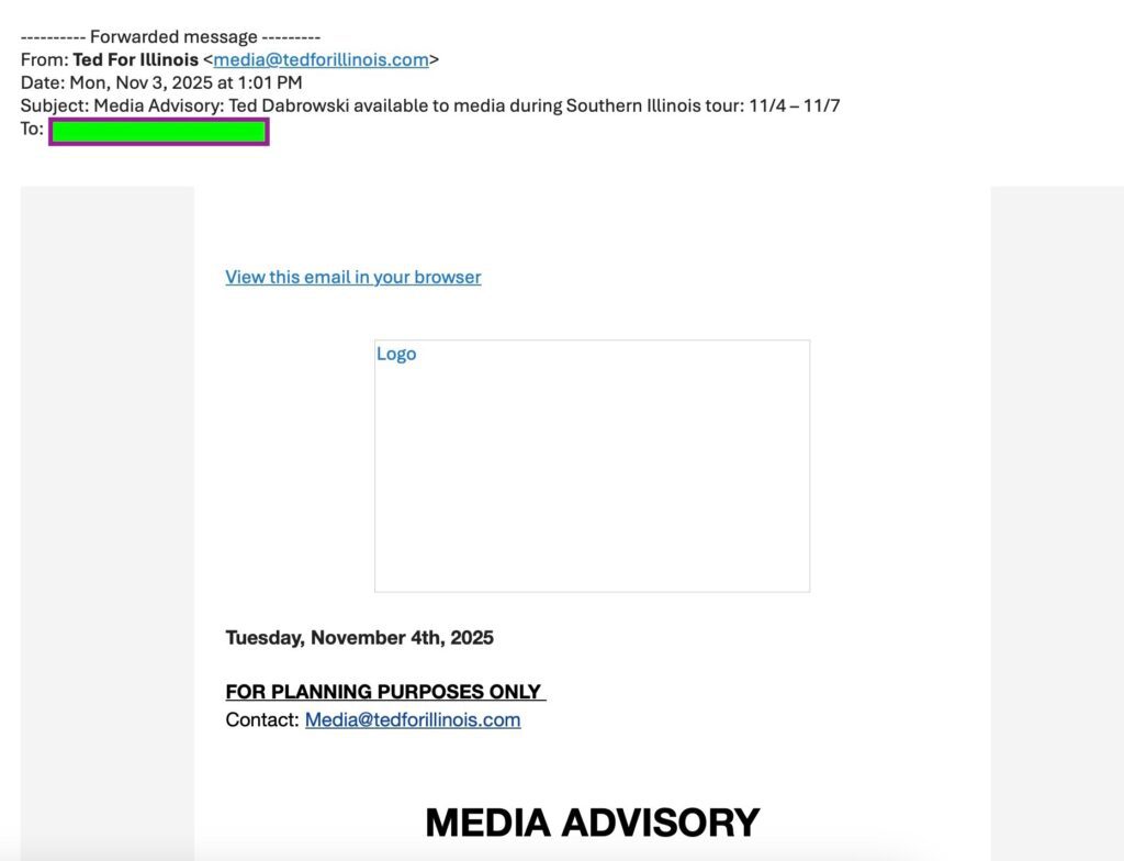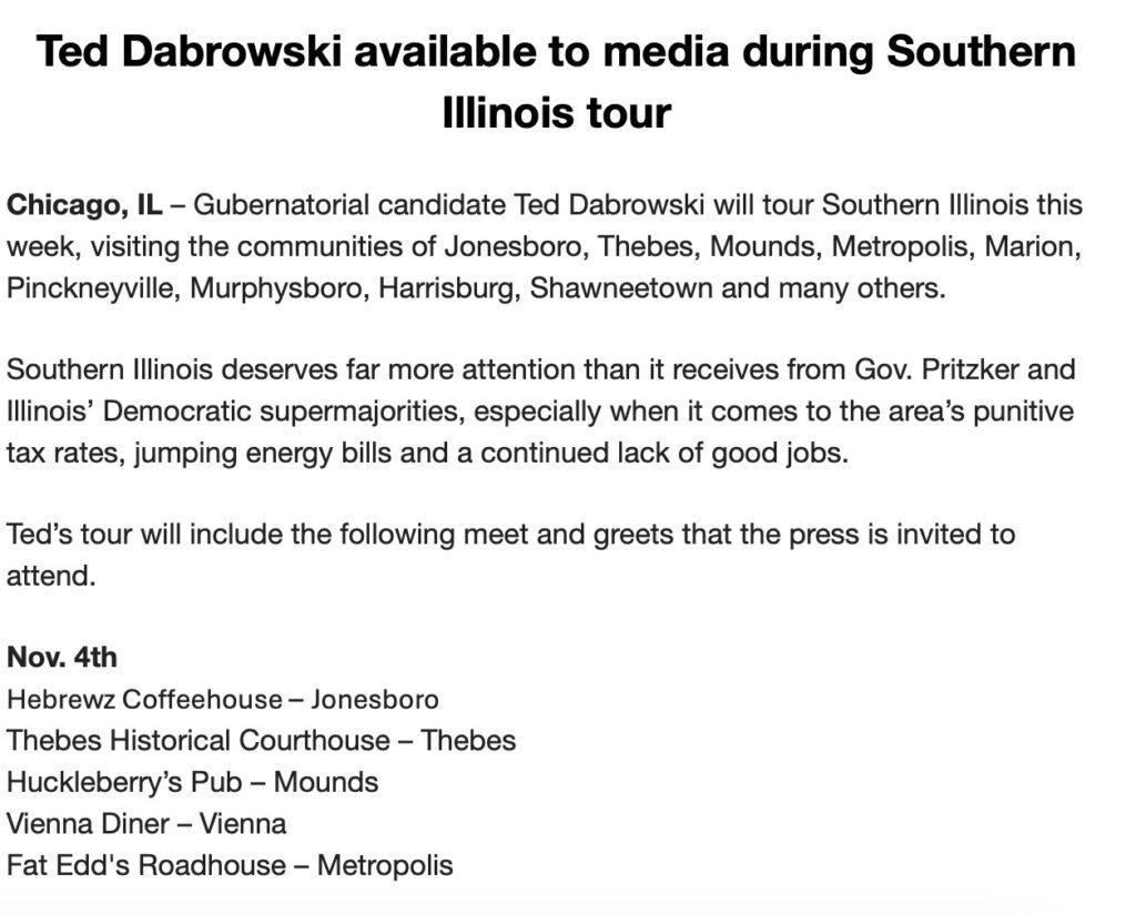 In a stunning display of political tone-deafness, the Ted Dabrowski gubernatorial campaign issued a southern Illinois media advisory in the middle of the Bailey family’s private graveside service on Monday – just as friends and loved ones gathered to lay to rest the family of former State Senator and gubernatorial candidate Darren Bailey’s son, daughter-in-law, and two young grandchildren.