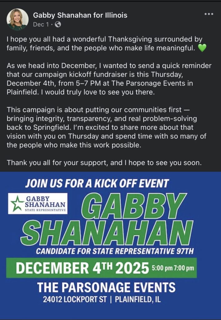 As previously reported, AFP-IL’s Grassroots Engagement Director, Gabby Shanahan, is also an active Republican candidate who has filed to run again for Illinois House District 97. Shanahan’s prior campaign relied heavily on institutional GOP money, and any future run will once again require approval and financial backing from House Republican leadership.