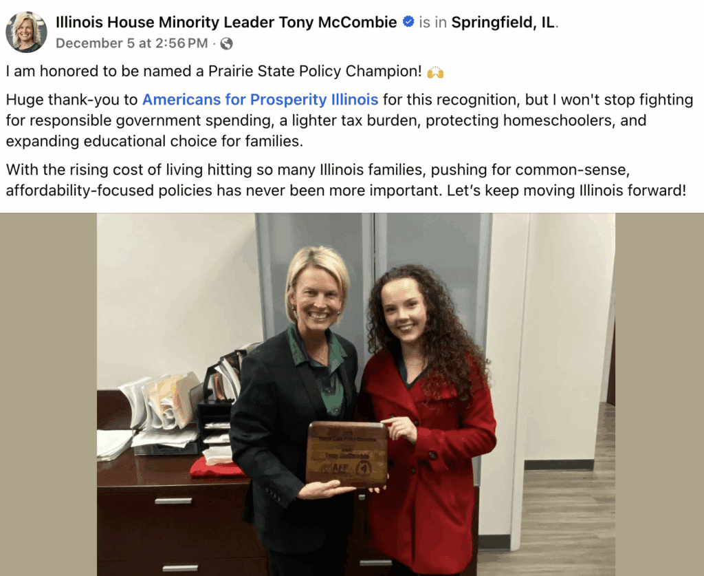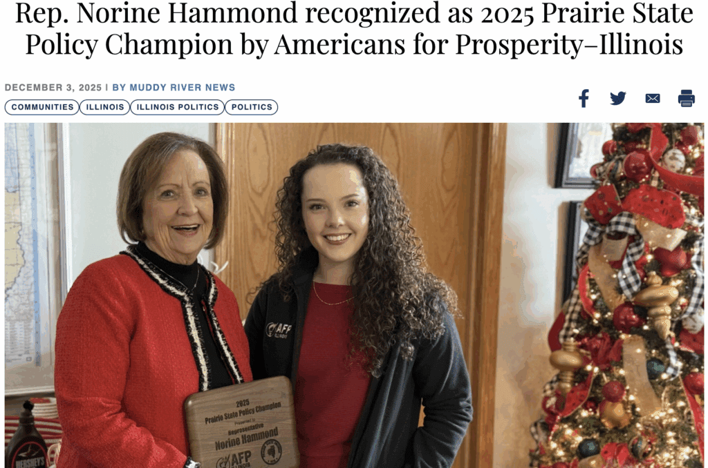 In the first week of December 2025, AFP-IL named House Minority Leader Tony McCombie and Deputy Minority Leader Norine Hammond as Prairie State Policy Champions, citing their advocacy for reducing government spending, lowering taxes, and promoting affordability-focused policies.