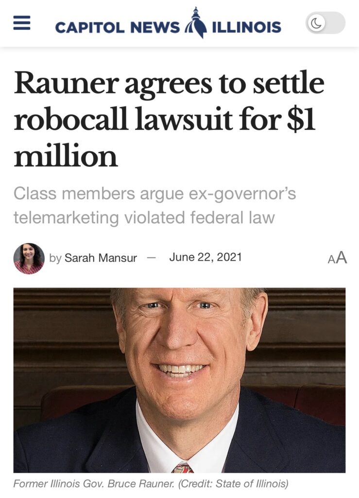 In Garvey v. Citizens for Rauner, a class-action TCPA lawsuit, former Governor Bruce Rauner’s campaign committee agreed to a $1 million settlement in 2021.
