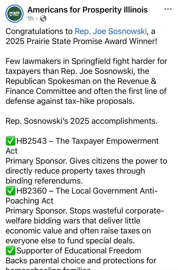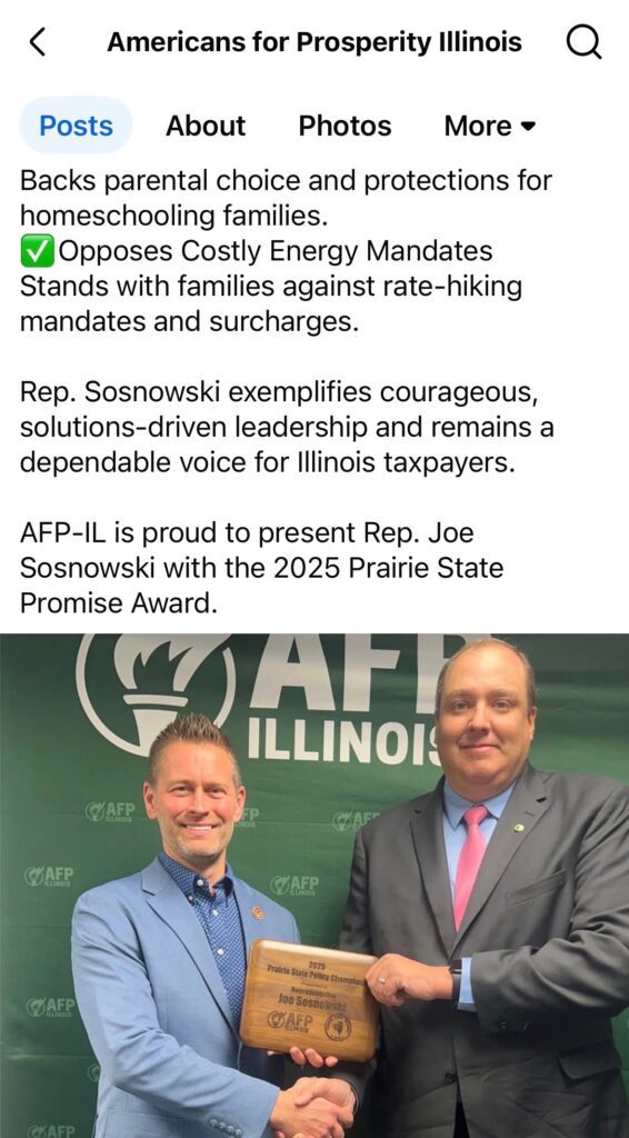 Despite that record, Americans for Prosperity Illinois recently handed Sosnowski its 2025 Prairie State Promise Award. AFP went even further, claiming Sosnowski “exemplifies courageous, solutions-driven leadership and remains a dependable voice for Illinois taxpayers.”
