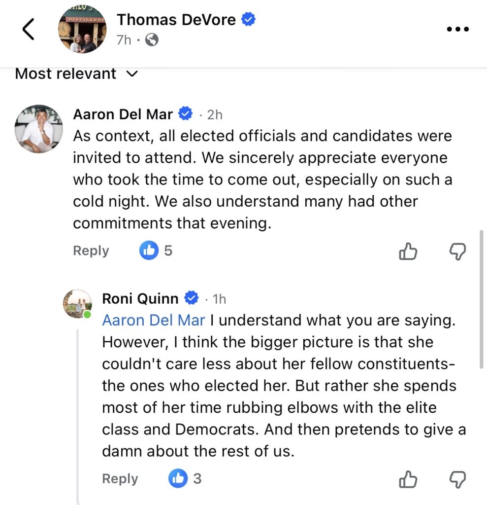 Grassroots frustration intensified when Del Mar weighed in on DeVore’s Facebook post with a polite, diplomatic comment emphasizing that all candidates were invited, thanking those who attended on a cold night, and noting that others had commitments.