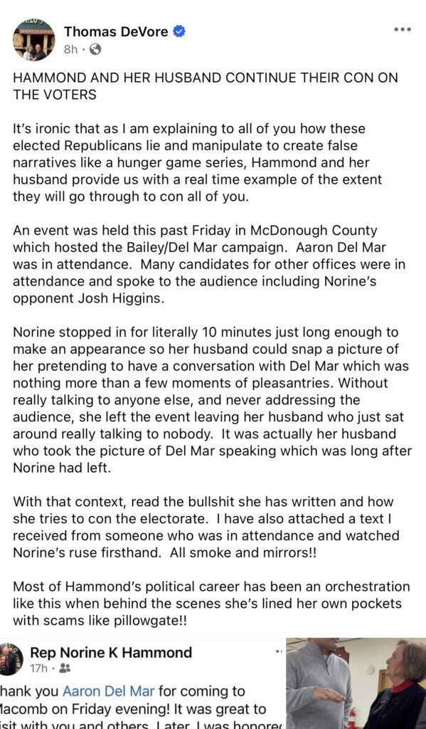 The controversy began after a Facebook post by Thomas DeVore detailed what occurred at a recent Bailey/Del Mar campaign event in McDonough County. According to DeVore and multiple attendees, Hammond stopped by briefly – staying roughly ten minutes – before slipping out the door prior to the start of the event. She did not address the audience or engage voters.