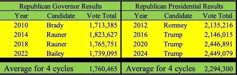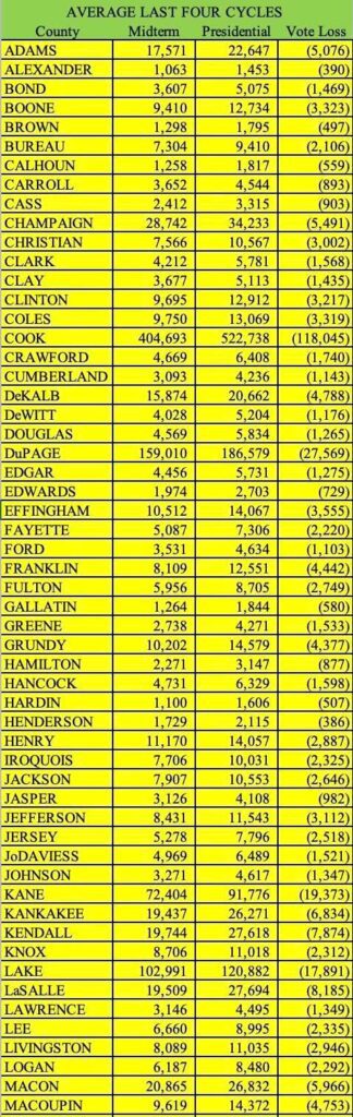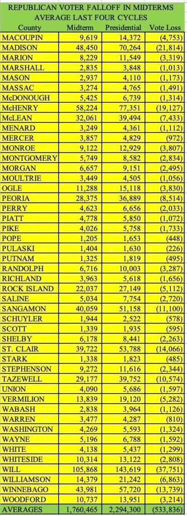 In 2026, projections show only 1.75 million Republicans will vote statewide. Meanwhile, an estimated 1 million right-leaning Illinoisans aren’t registered, another 1 million are registered but never vote, and 750,000 vote only during presidential years.