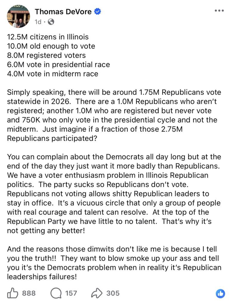 “Just imagine if a fraction of those 2.75 million Republicans participated?” DeVore said, arguing that even a modest increase in GOP turnout would fundamentally reshape the Illinois political map.