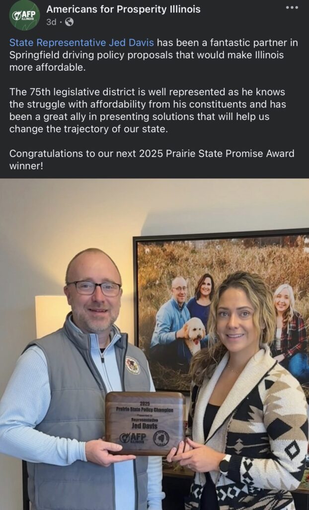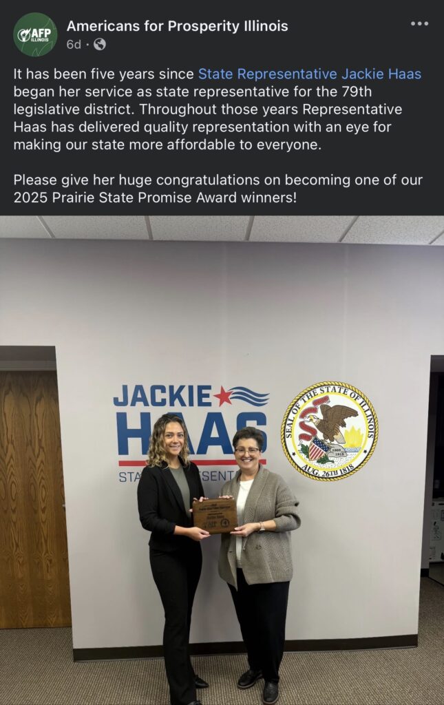 Those facts alone matter. But the optics worsen when Shanahan appears publicly handing out legislative and policy awards to House Republican lawmakers on behalf of AFP-IL – legislators connected to the same political ecosystem that heavily funded her campaign and may again be asked to support her future run.
