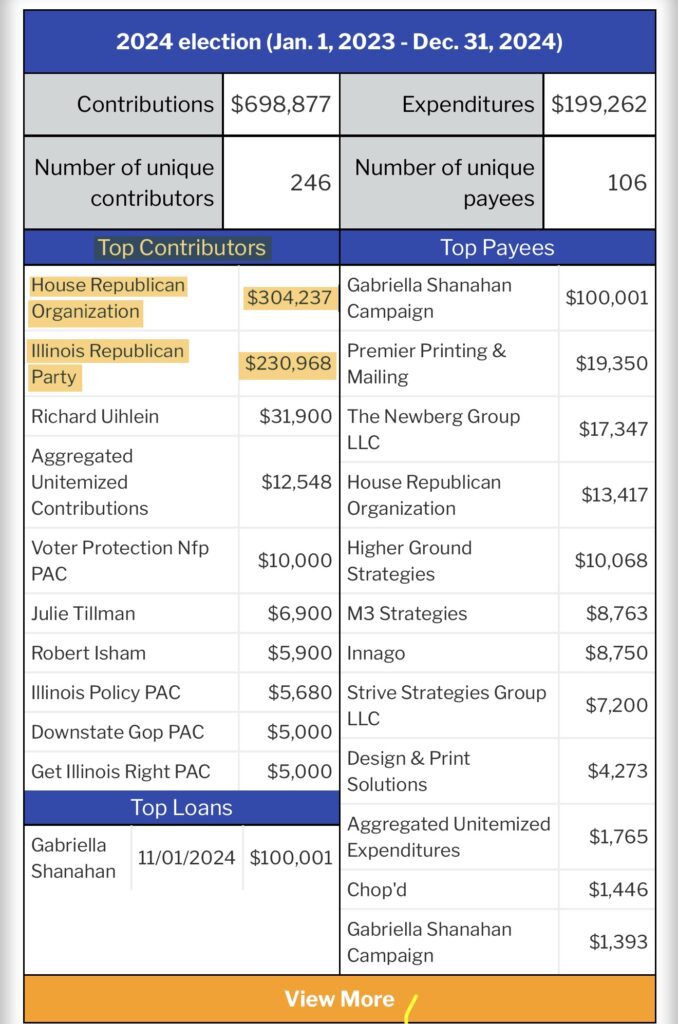 During the 2024 election cycle, Shanahan’s campaign committee, “Team Shanahan,” received massive financial support from Republican political organizations. Records show more than $304,000 came from the House Republican Organization and another $230,968 from the Illinois Republican Party. Combined, that is roughly $535,000 in institutional GOP money backing her failed campaign.