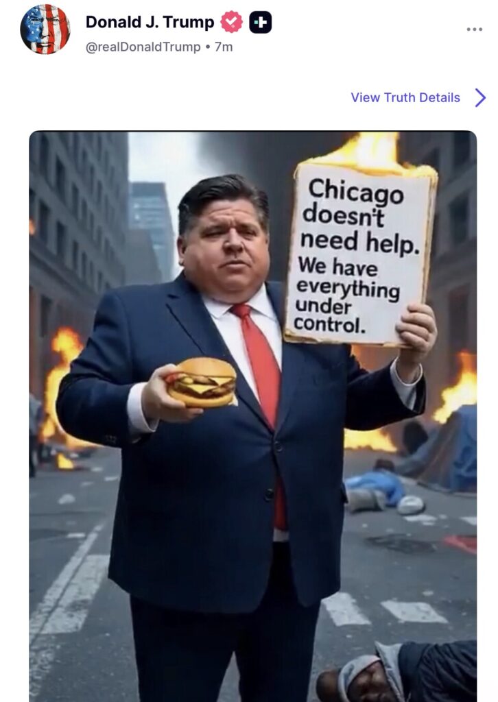 On Friday, Donald Trump weighed in on Chicago’s chaos with a blunt jab at Illinois Democrats. Posting on Truth Social, Trump shared an image of JB Pritzker holding a cheeseburger while Chicago burns behind him. The caption read: “Chicago doesn’t need help. We have everything under control.”