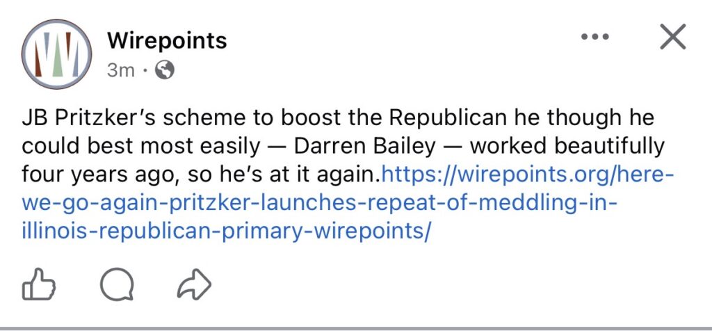 One article cited in the complaint discussed Republican gubernatorial candidate Darren Bailey, characterizing him as a weak nominee and framing him as the preferred opponent of Democratic Gov. JB Pritzker. The article analyzed campaign strategy and political positioning rather than legislative or fiscal policy.