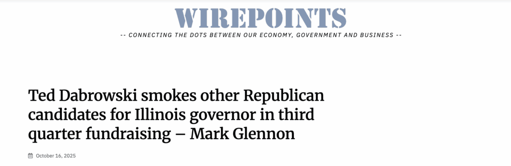 The filing also references a second Glennon article published October 16, 2025, titled “Ted Dabrowski smokes other Republican candidates for Illinois governor in third quarter fundraising.”