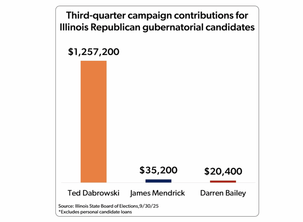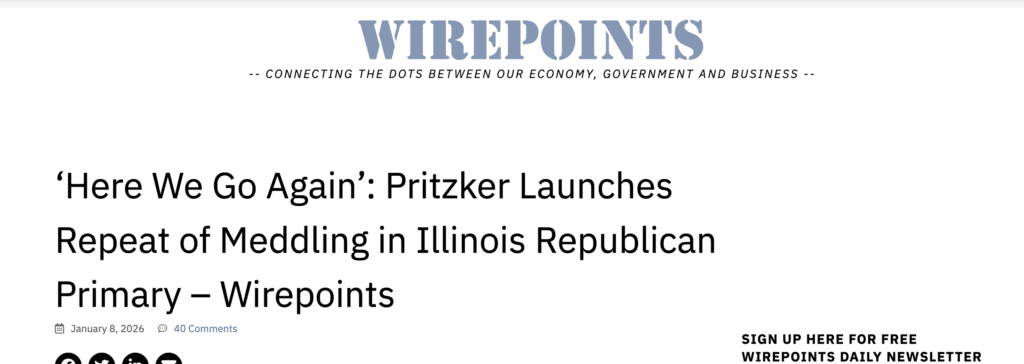 At the time of publication, Ted Dabrowski – Wirepoints’ former president – was a declared candidate for governor in the same Republican primary. Dabrowski resigned from his leadership role at Wirepoints in September 2025, citing the need to comply with federal restrictions on 501(c)(3) organizations before launching his campaign. He subsequently announced his candidacy, selected a running mate, and began fundraising.