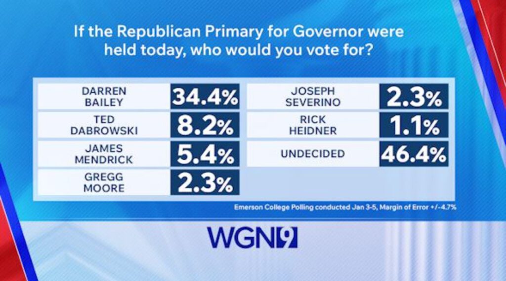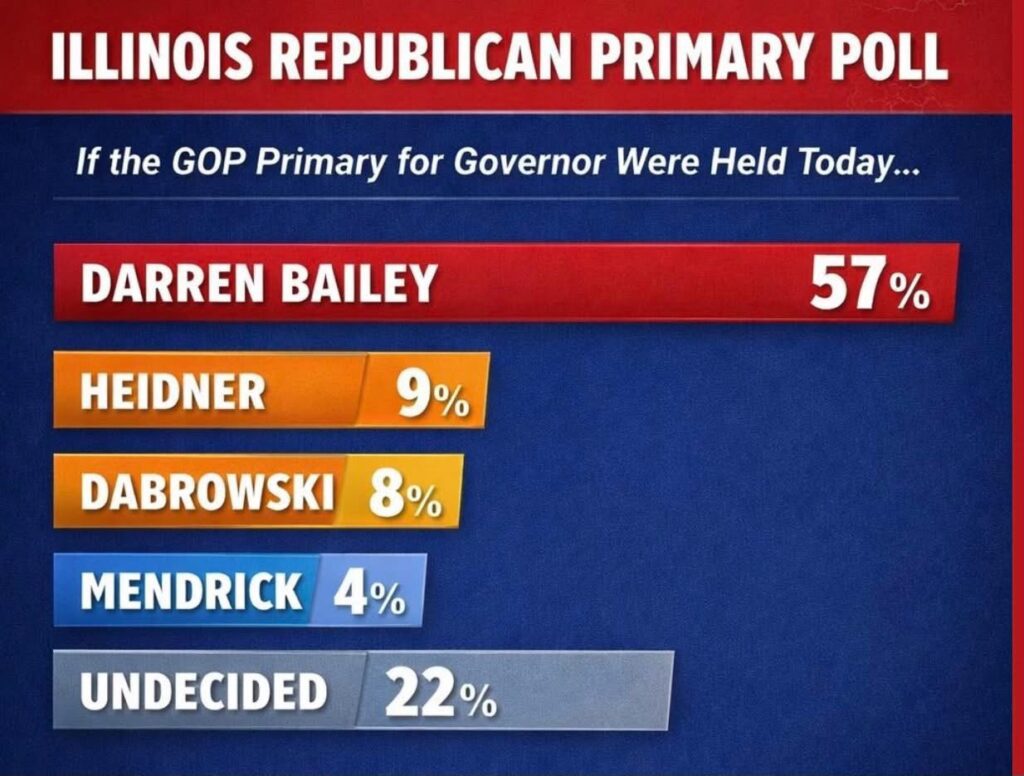 A new survey of likely Republican primary voters shows former state Sen. Darren Bailey expanding his lead in the 2026 Illinois Republican primary for governor, reinforcing findings from an earlier major poll released by WGN-TV.