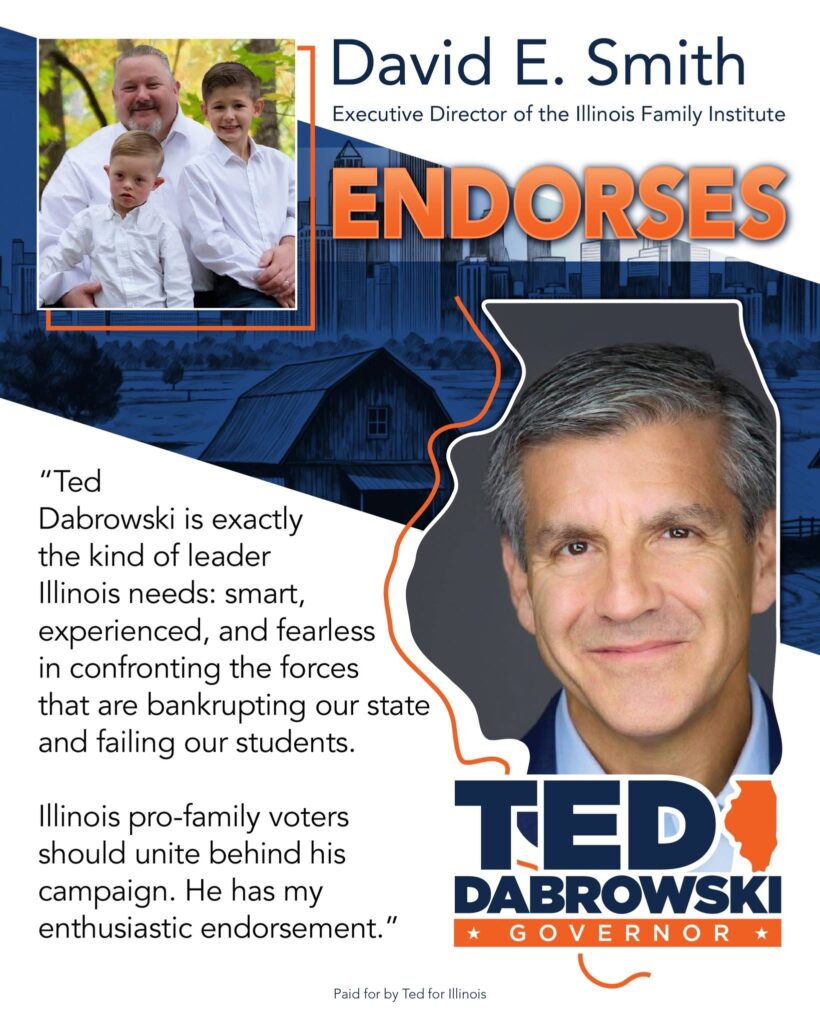 “Ted Dabrowski is exactly the kind of leader Illinois needs,” Smith said. “Illinois pro-family voters should unite behind his campaign. He has my enthusiastic endorsement.”