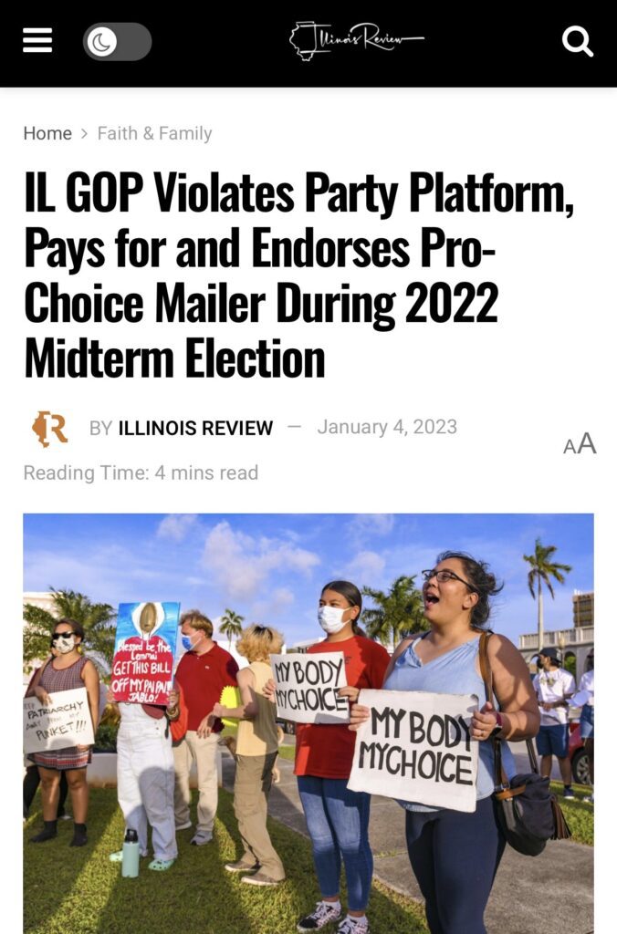 The controversy also revives memories of a 2022 incident that deeply angered pro-life activists. Illinois Review publicly condemned the Illinois Republican Party after it sent a state party-funded campaign mailer widely viewed as accommodating pro-choice messaging.