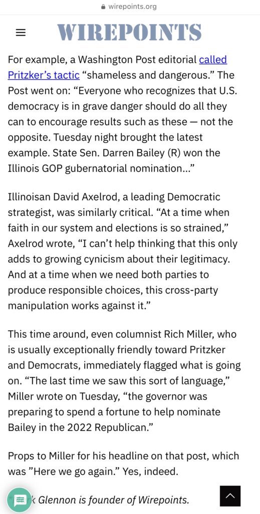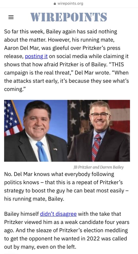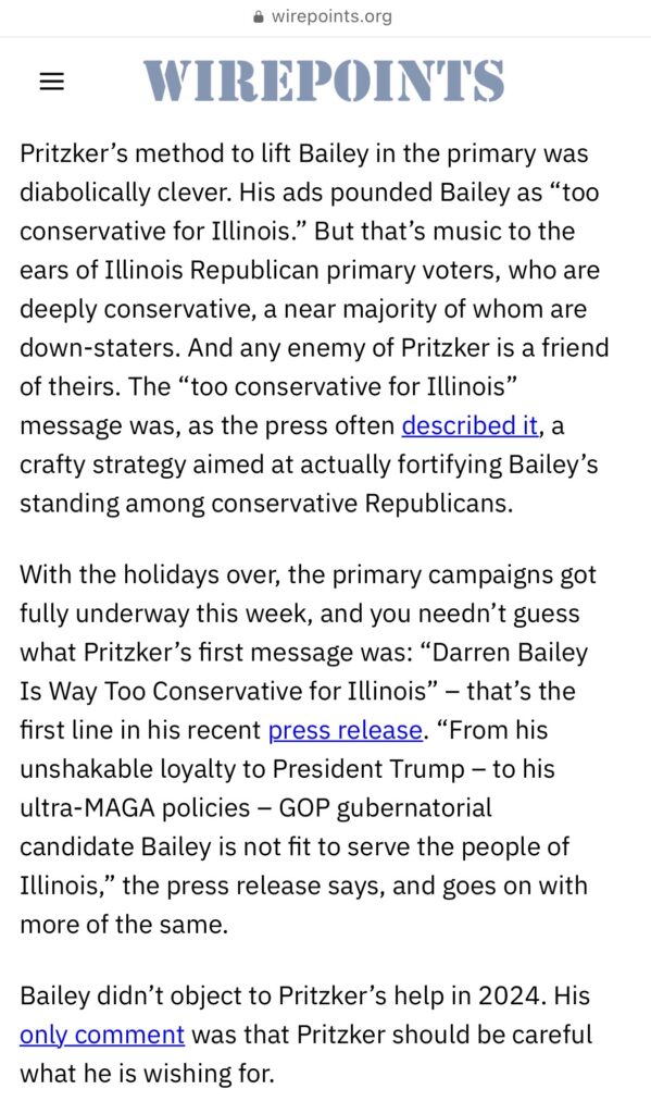 The article, written by Mark Glennon, frames Bailey as the preferred opponent of Democratic Gov. JB Pritzker and portrays him as a weak candidate easily manipulated by Democrats. It goes further, suggesting Republican voters are naive for supporting Bailey.