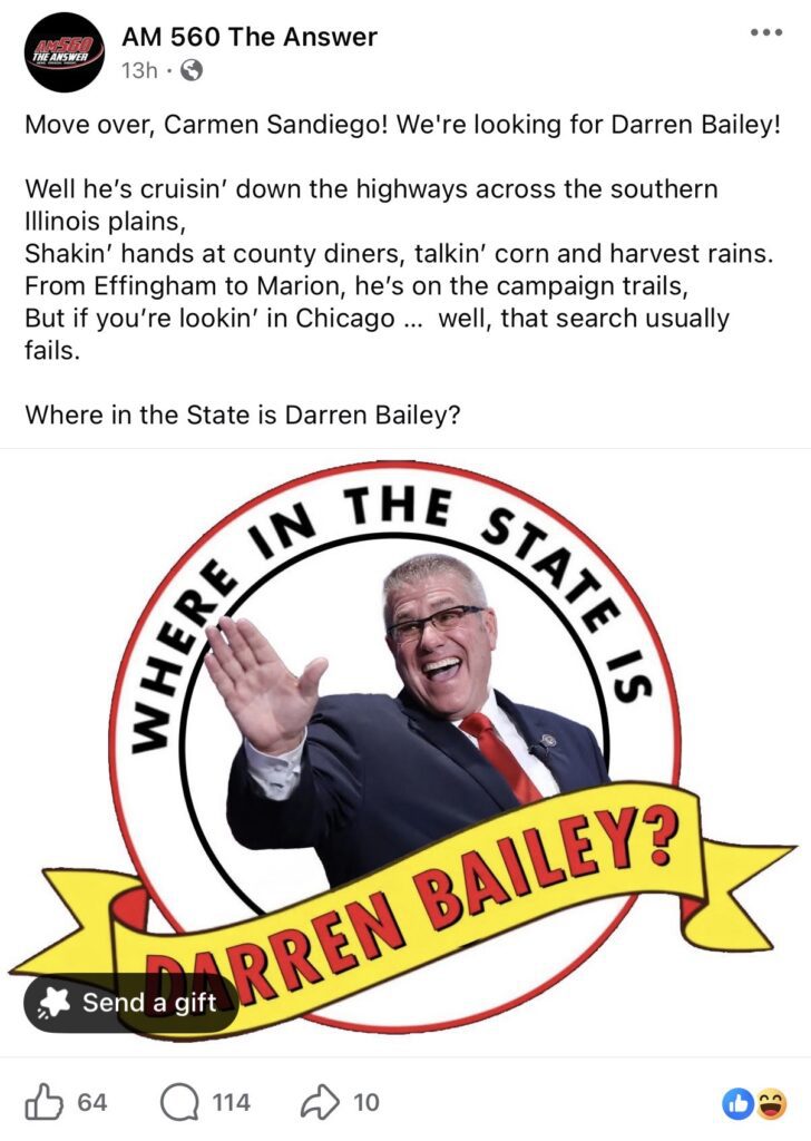 “In 2022, Darren Bailey received about 120,000 fewer Chicago metro votes than Rauner in his 2018 loss. Maybe Darren needs to get a new map of Illinois,” the station’s Facebook page wrote.