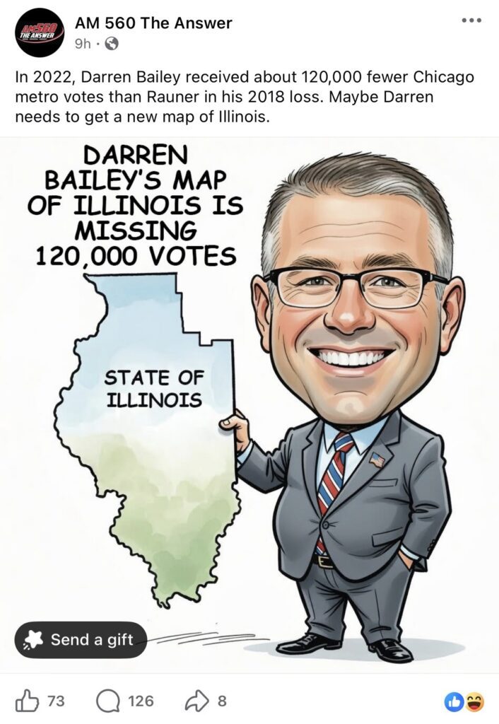 “In 2022, Darren Bailey received about 120,000 fewer Chicago metro votes than Rauner in his 2018 loss. Maybe Darren needs to get a new map of Illinois,” the station’s Facebook page posted.