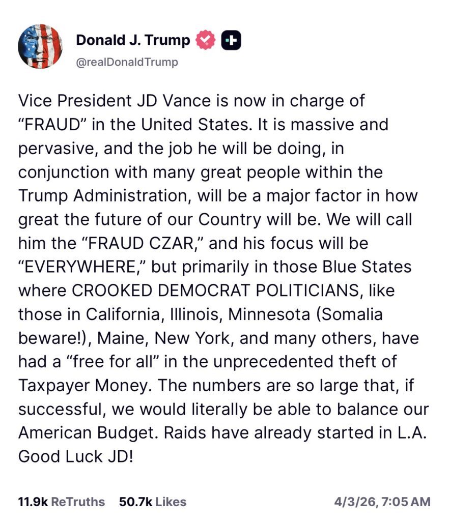 Trump did not mince words in his Truth Social announcement. He called fraud in federal programs “massive and pervasive,” pointing directly to blue states where he says “crooked Democrat politicians” have allowed a “free for all” with taxpayer money.